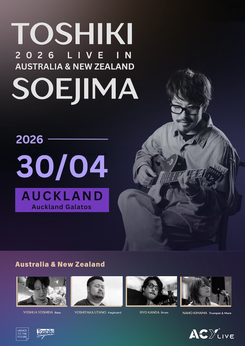 Toshiki Soejima makes his long-awaited debut in New Zealand with an immersive live tour that traces his journey from intimate beginnings to the global stage. Blending neo-soul, jazz, hip-hop, and contemporary groove-driven aesthetics, Toshiki has become one of Japan’s most influential instrumental voices, known for his expressive guitar work, emotional depth, and genre-fluid sound.